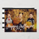 Cartão de férias moderno com as palavras "Happy Halloween" num guião branco, manuscrito, com a sua fotografia apresentada atrás. A camada branca, o coração e o texto podem ser posicionados em qualquer lugar na placa. A parte traseira da placa apresenta um padrão listrado de cor d'água preto e branco.