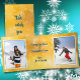 Cartão de Natal com fotos triplas com duas dentro grandes. Douradas bolhas e estrelas no fundo, este cartão tem texto azul escuro e em negrito no centro para uma saudação e assinatura, com texto na frente que diz: "Desejamos" - pode ser alterado ou apagado. Carregue fotos para os lados esquerdo e direito que estão emolduradas em branco com uma borda fina de linha azul. O exterior tem o mesmo design de ouro. Este cartão de feriado simples e exclusivo funciona para compartilhar fotos da família e para namorado / namorada no Natal.
