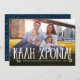 Com as palavras "Feliz ano novo" (Kali Xronia) escritas em grego, este cartão com fotos é perfeito para enviar para Yiayia e Papou e toda a sua família e amigos gregos. O texto branco se senta na parte inferior de uma foto horizontal. O backer é um clássico azul marinho esbranquiçado de branco. O azul pode ser alterado clicando em "personalizar mais".