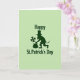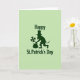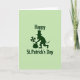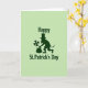Concebido com um fundo verde lima pastel suave, este cartão do Dia de São Patrício centra-se numa silhueta de um leprechaun verde escuro numa pose animada e ligeiramente atrevida. Ele usa um chapéu alto e uma barba fluída, inclinando-se para perto de um pote redondo como se estivesse a partilhar um segredo com alguém fora do enquadramento. Entre as suas mãos está um trevo de quatro folhas ☘️, segurado com um toque cuidadoso que parece uma pequena oferta afetuosa. A paleta de duas cores mantém a cena simples e fácil para os olhos, ao mesmo tempo que evoca aqueles verdes irlandeses exuberantes 💚. A frase “Feliz Dia de São Patrício” aparece no topo e novamente na parte inferior, definida numa fonte serifada verde escura que combina com o leprechaun. As letras ficam alinhadas acima e abaixo da ilustração, enquadrando a figura e o pote como uma borda arrumada. A aba do
