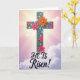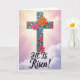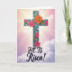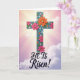 Este design mostra uma cruz alta e estilizada centrada no cartão, com uma aparência texturizada e quase esculpida que lhe dá profundidade. Flores rosa brilhante e laranja quente se agrupam ao longo da cruz, suas pétalas em camadas sugerindo um abraço suave e afetuoso, enquanto formas florais em azul-turquesa menores adicionam um toque amigável e companheiro. Pontos e destaques azul-claro suaves estão ao redor das flores, como pequenas notas de celebração, com uma 🌷 inserida no clima primaveril. Atrás dela, o céu desvanece de rosa dourado perto do topo para um lavanda tranquilo na parte inferior, com nuvens finas se deslocando. Raios de luz se espalham por trás da parte superior da cruz, formando um efeito de halo suave que atrai o olhar para cima. Perto da parte inferior, as palavras “ELE RESSUSCITOU!” estão colocadas em letras grandes, definidas em uma tinta escura que se destaca claramente contra o fundo mais claro 🐰. A cruz repous