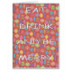 Coma bebida e seja feliz saudação de Natal em letras brancas com decoração de árvores de Natal em azul, verde, amarelo, roxo e rosa com fundo vermelho.