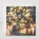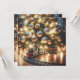 Cartões de Natal adoráveis que você pode personalizar com sua própria mensagem de feriado. A frente é uma cena adorável com uma pista de trem vintage ao redor de uma árvore de Natal enfeitada em ornamentos de ouro e luzes iluminadas.