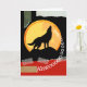 Ahwooo Happy Howl-o-between com lobo uivando, lua de cheio, e colagem de arte com papéis rasgados e fita. Feliz cartão de cumprimentos de Halloween. Arte, imagem e direitos de autor versos © Shoaff Ballanger Studios, 2022.