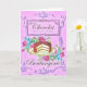Uma placa de compro de pastelaria com bolo de chocolate e flores. Em cores rosa e roxo.