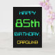 Este simples e divertido design de cartões de aniversário apresenta uma mensagem como "FELIZ 85º ANIVERSÁRIO, CAROLINE!" Sua aparência é inspirada no campo da computação digital. O nome na frente e a mensagem no dentro podem ser personalizados. Pode ser enviado ou dado a alguém que comemora seu oitenta e cinco anos de aniversário, e que talvez trabalhe como administrador de banco de dados, programador de computador, administrador de rede, desenvolvedor de software, engenheiro elétrico, ou que de outra forma gosta de usar computadores. [~Z0000100]