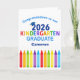 This cute 2026 kindergarten graduation card features a cool grad cap above colorful writing and a row of crayons in rainbow. Customizable kindergartener graduate congratulations card in fun colors for the last day of elementary school with your kid's name personalized in blue. Congratulations to our kinder grad!