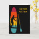 Crie um cartão personalizado para aniversários ou qualquer ocasião. Este cartão de saudação é perfeito para os carregadores de remo. Apresenta uma ilustração de um SUP ou conselho de remo e remo rebatíveis em cores vibrantes do pôr do sol com uma ilustração da silhueta a preto de um remo. O gráfico é colocado sobre um fundo preto. Há um ponto para adicionar sua própria mensagem na frente e na dentro deste cartão.