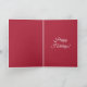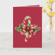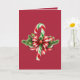 Uma bengala verde, vermelha e branca é guardada com galhos verdes e um arco vermelho e branco sobre fundo vermelho, criando um belo e festivo cartão de Natal. A dentro do cartão também é vermelha, com a saudação em branco.