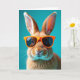 This design shows a close-up portrait of a golden-brown domestic rabbit set against a smooth, bright cyan background, with a flirty, friendly mood in the way its face is centered and gently angled toward you 🐰. Fine fur textures and crisp whiskers stand out, while the tall ears soften and fade slightly as they rise, keeping attention on the rabbit’s expression. A pair of rectangular orange-framed eye coverings rests across its nose, and the dark lenses still allow a small peek of calm blue eyes, like a shy glance. The rabbit’s pink nose sits neatly below, adding a tender detail that pairs nicely with the warm coat color. Near the top, a short Easter greeting appears in small, neat lettering in white, spaced so it doesn’t crowd the portrait 🌷. The text stays simple and centered, floating above the rabbit’s head to keep the focus on the face. The orange frames pop sharply against the cool cyan field, with the ear tips dissolving softly into the background.