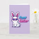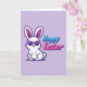 This greeting card features a white cartoon bunny 🐰 standing slightly left of center against a smooth lavender background, with a small shadow beneath its feet that keeps the scene grounded. The bunny’s long ears tilt upward with bright pink inner details, and it wears chunky pink glasses with shiny blue lenses that catch the light like a flirty glance across the room. A tiny tongue peeks out, giving the character a teasing, friendly attitude that feels like an inside joke shared with someone close. To the right, the greeting text sits in two stacked words, with “Happy” in bright blue above “Easter” in hot pink, both outlined and shaded to look slightly raised. The colors—lavender, blue, and pink—work together like a coordinated pair, making the bunny and the message feel connected, like a cheerful note passed between friends. The layout leaves open space around the character and lettering so the design feels airy and easy to read 🌷. The bunny’s pink frames, blue lenses, and upright ears stand out sharply against the flat purple field beside the blue “Happy” and pink “Easter” text.
