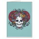 O crânio bonito do jardineiro da senhora, com o buquê do cabelo das flores, em um coração com swirlies pequenos. O hippie que aflige, cores silenciado do vintage, t-shirt, sua, cartões, presentes.