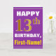 As características deste design aniversário-temáticos simples do cartão um desejo morno do aniversário gostam "do 13o ANIVERSÁRIO FELIZ, nome!" na parte dianteira, no texto corajoso em um roxo coloriu o fundo. O número do aniversário tem o falso/imitação ouro-como a aparência da coloração. O nome na parte dianteira pode ser personalizado. As características internas uma mensagem customizável do aniversário. Um cartão como este poderia ser uma maneira do divertimento de entregar desejos do aniversário a alguém que está comemorando seu décimo terceiro aniversário. [~Z0000277]
