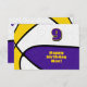 Esta divertida equipe colorido o cartão de aniversário de basquete pode ser baixado e pode ser personalizado e enviado eletronicamente a um jovem jogador de basquete para desejar-lhe um feliz aniversário - a imagem abstratamente sobredimensionada de uma bola de basquete com painéis roxos, brancos e dourados alternados cobrir da frente e do verso da carta - texto é atualmente uma mensagem de aniversário, mas pode ser personalizado para um desejo de boa sorte - por katz_d_d_zynes