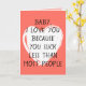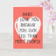 Um bom cartão de saudação com uma citação engraçada para o amor de sua vida, marido ou esposa, menino ou namorada, ou mesmo sua mãe ou pai, em um coração branco desenhado à mão sobre um fundo cor de coral laranja vermelho. Com a opção de personalizar com nome, palavra ou texto (limitado) de sua escolha. Deixe que aqueles com senso de humor saibam que você os ama até a lua e de volta com este sarcástico e humorístico 'EU TE AMO PORQUE VOCÊ SUCA MENOS DO QUE A MAIORIA DAS OUTRAS citações PESSOAS.