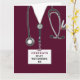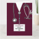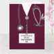 Cartão único de graduação de enfermeira que inclui esfregões de hospital de marôons, um estetoscópio e uma engraçada ilustração do canivete suíço. Editar texto para adicionar o nome da enfermeira.