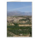Olhando para uma típica vista de Verão de Creta, olivais em campos secos e áridos com montanhas ao fundo.