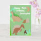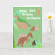 Diga Feliz Aniversário com este cartão de crianças bonitinhas. Este cartão apresenta três dinossauros sobre um fundo verde macio. A idade e o nome podem ser personalizados.