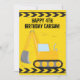 Legal cartão de aniversário feliz e personalizado para uma criança que ama veículos de construção amarelos em preto e amarelo. Design de veículo divertido para um menino que ama carros e caminhões. Personalize com o nome do seu filho sob a fita de precaução preto e amarelo.