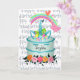 Cartão de aniversário de criança que você pode personalizar. Feliz aniversário em letra unicórnio por todo o cobrir, com bolo projetado por unicórnio, arco-íris e corações. Dentro é texto Feliz Aniversário, Tenha um Dia Mágico.