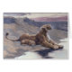 Lioness fica ao lado do filhote em uma praia arenosa ao lado da água. Ela fica cuidadosa cuidando de qualquer perigo. Um maravilhoso cartão de vida selvagem de vintage.