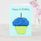 Feliz Primeiro Aniversário é escrito em roteiro preto. Fundo azul claro. Personalize para qualquer idade. Grande cupcake de chocolate em um invólucro amarelo verde pleado. Glacé azul com aspersores e vela de chama colorida com oscilação por cima. Dentro de imagens de balões de aniversário coloridas. Deixe o cartão verso, ou personalize-o com o seu próprio cartão. Arte original e Design © TamiraZDesign.