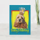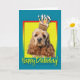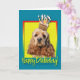 Celebrar um aniversário com este Cartão de Saudação de Cachorro Cocker Spaniel. Com um cupcake balanceado na cabeça, este design pode trazer um sorriso e risadinhas! BTW, Este design tem várias versões, com diferentes cores de fundo. Há também um convite para uma versão do Partido.