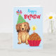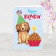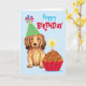 Feliz aniversário com este design bonitinho com um sorridente e vestido cachorrinho de Longhaired Dachschund com um cupcake de aniversário. O texto pode ser facilmente alterado; basta clicar no botão personalizar.