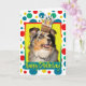 Celebre um aniversário com este cartão australiano de saudação de pastor australiano. Com um cupcake balanceado na cabeça, este design pode trazer um sorriso e risadinhas! BTW, Este design tem várias versões, com diferentes cores de fundo. Há também um convite para uma versão do Partido.