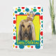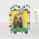 Comemore um aniversário com este cartão afegão lunático do cão. Com um cupcake equilibrado nela é a cabeça, este design é certo trazer um sorriso e risos! O BTW, este design tem diversas versões, com cores diferentes do fundo. Há igualmente um convite a uma versão do partido.