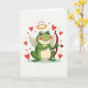 This Valentine’s Day greeting card features an adorable frog dressed as Cupid, centered on a bright white background. The frog is green with a creamy belly, big shiny eyes, and a wide smile, with soft pink blush on its cheeks that adds extra charm. Small white feather wings rest on its back, and a golden halo floats just above its head. In its hands, the frog holds a deep red bow and a matching arrow, ready to send love in your direction. Red hearts in different sizes float around the frog, filling the space with affection ❤️💌. There is no text on the front, letting the illustration share the message on its own. It’s a sweet, cheerful card that works beautifully for Valentine’s Day, romance, or a kind note to someone you care about