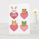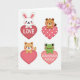 Designed with four cute animals peeking out from behind big hearts, this card shows a rabbit, a bear, a cat, and a frog looking straight at you with wide eyes and small smiles. The rabbit and bear sit on the top row, while the cat and frog are below them, all set against a plain white background. Each character has soft colors, with pink cheeks that add a sweet, caring feel ❤️. The hearts are the main focus, and they come in shades of pink and red, with one heart showing the word “LOVE” in simple white letters near the center. Another heart has white polka dots, one is a solid pink heart, and the frog’s heart has white zig-zag lines for extra detail. The overall look is calm and friendly, like a small moment of affection shared between friends or sweethearts 💘. It’s an easy card to give when you want to say something kind without making it complicated.
