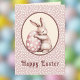 This polka dot Easter card features a cute baby bunny hugging a mauvy pink easter egg with white polka dots. The background is also a pinkish mauve with white polka dots. Happy Easter is printed in pinking brown at the bottom of the card. The inside of the card is a creamy off white and the back is the same polka dot pattern as the front, almost like dotted Swiss fabric.