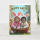 This card shows two small cats cuddled close in a rustic woven basket, dressed in soft hooded outfits with long bunny-like ears 🐰. The left cat is a ginger tabby in a rosy pink outfit with a matching bow, leaning slightly toward its companion as if sharing a quiet, trusting moment. Beside it, a grey tabby with faint stripes wears a white outfit with a cream bow, their faces turned forward with wide green-gold eyes that feel gently inviting. Light falls across their fur and the fabric, bringing out tiny whiskers, fluffy cheeks, and the basket’s braided texture. Behind them, a softly blurred spring scene stretches out with green foliage and a clear blue sky, giving the couple a cozy little spotlight. Across the top, a cheerful holiday greeting appears in green lettering, centered like a header above their ears 🌷. In the grass at the bottom, two smooth pastel pink egg shapes rest near the basket.