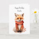 Birthday card with an illustration of a reddish orange fox pup. A subtle smile on his face. Wearing a nice red scarf for warmth.