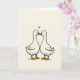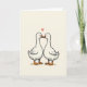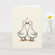 This greeting card features two white geese facing one another in the center, their long necks curving inward so their beaks meet in a gentle kiss. Each goose has a soft pink blush on its cheeks, adding a shy and sweet expression. Their bright orange beaks and webbed feet stand out against their white feathers. Just above where their beaks touch floats a single red-orange heart, clearly showing the theme of love. The background is a warm tan tone with a subtle paper-like texture that keeps the focus on the geese. There is no text on the front, allowing the illustration to speak for itself. The scene feels calm, caring, and tender, making this card a lovely choice for Valentine’s Day, anniversaries, or any moment when you want to share affection without words.