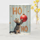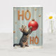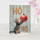 This beautiful picture shows a cozy holiday scene with a cute tabby kitten 🐱. The kitten is standing on white snow with adorable striped fur, looking up at a big red Christmas ornament 🎄. The red ornament really stands out against the blue-green background. There are shiny golden elements like "HO" letters, stars, and snowflakes that add to the festive feel ✨. The whole scene has a warm, magical glow that makes you feel happy and joyful 🌟. On the card, it says "Wishing you a purr-fect holiday season!" in fancy letters near the kitten 🎅🏼. This card is perfect for making someone's holiday extra special and cheery!