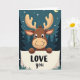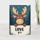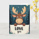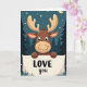 This card shows a cute cartoon moose peeking over a soft, parchment-like banner in a quiet night forest. The moose has big, gentle eyes and a friendly expression, with pale antlers and a small tuft of fur on its head. Across the banner, the words “LOVE you” are written in a hand-drawn style, with “LOVE” standing out clearly and “you” following right beside it. Behind the moose is a deep teal sky with small white stars, some as simple dots and some as tiny four-point sparkles. A pale crescent moon sits in the upper right, adding to the calm nighttime feel. Dark pine trees frame the scene on both sides, and a touch of green leaves sits below the banner. It feels meaningful because it’s simple and sweet, like a quiet way to say “I care about you” without needing a big speech 🥰❤️.