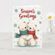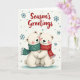 Small light blue snowflakes and dots on the white background make it feel even more like winter, creating a magical atmosphere. At the top, there's elegant red cursive writing that says 'Season's Greetings.' It ties everything together with a cheerful message. This artwork combines cute design with gentle colors, spreading holiday joy and warm wishes. It's a wonderful card to share holiday cheer with your loved ones. 🎅🏼🎄🎁