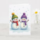This beautiful card shows two happy snowmen as the main focus in a snowy winter setting. They are round and plump, with a 3D effect that makes them stand out against the white backdrop, with a hint of light blue snow at their feet. The snowmen are happy next to each other, spreading joy through their big smiles.