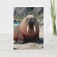 Walrus themed birthday card. A cute walrus laying on a sandy beach by the ocean on a sunny day. Background of cliffs and blue ocean waves.