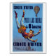 Soirs dos les de Tous do dʹHiver de Cirque…, heures do à 8. O poster francês do circo mostra um aerialist que flutua com os braços outstretched acima de uma skyline da cidade com um balão no fundo.