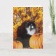 Fotografia bonita de um gato preto e branco, com folha bonita em torno dela e duas abóboras no primeiro plano. Grande cartão para o Dia das Bruxas ou a acção de graças, e especialmente excelente para algum amante do gato. Personalize o cumprimento para dentro para dizer o que você quer.