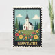 Este cartão de cumprimentos mostra uma cena da paisagem rural da primavera enquadrada como um selo postal antigo com pequenas perfurações nas bordas e uma textura levemente desgastada. No centro, há uma pequena capela branca com uma torre escura encimada por uma cruz e uma porta frontal vermelha que parece um convite aberto para que os amigos entrem juntos. Árvores de folhas perenes verde-escuras se agrupam ao seu redor, contra um céu azul calmo com nuvens arredondadas e suaves. O primeiro plano é um prado ondulado repleto de grandes flores amarelo-douradas, flores coral-vermelhas e pequenas flores brancas em forma de estrela, com toques extras de rosa e laranja espalhados entre 🌷. As cores são brilhantes, mas suavemente atenuadas, dando à cena um aspecto aconchegante e afetuoso, como se a paisagem estivesse se inclinando para dar as boas-vindas 🐇. Perto da parte inferior, as palavras “FELIZ PÁSCOA”