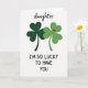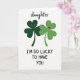 Este cartão mostra dois trevos com rostos amigáveis, centrados em um fundo branco, inclinados um para o outro como se estivessem compartilhando um momento tranquilo e afetuoso 💚. Um é um verde esmeralda profundo com um sorriso pequeno e tímido, enquanto o outro é um verde lima mais brilhante com um sorriso largo e uma boca vermelha que se destaca. Suas folhas se sobrepõem ligeiramente, fazendo com que pareçam companheiros próximos que não se importam em estar rosto a rosto. Suaves variações nos tons de verde adicionam um pouco de profundidade, mantendo a ilustração simples e suave. Perto do topo, a palavra “filha” está acima dos personagens em letras verdes fluidas que parecem suaves e próximas. Perto da parte inferior, “EU SOU MUITO SORTUDO POR TER VOCÊ” aparece em letras maiúsculas em um verde mais escuro, em um estilo direto que equilibra a imagem. O layout permanece centrado e arejado, com muito espaço branco ao redor do par e um pequeno ☘️ sentimento transmitido pela paleta verde. Os dois trevos permanecem o foco principal,