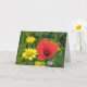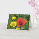 Uma papoila vermelha brilhante está para fora entre a grama verde e algumas flores amarelas bonito