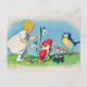 Esta imagem do vintage tem uma menina loura falar com um exército de homens pequenos do cogumelo. Um pássaro doce está juntando-se lhes. Estão estando pelos lírios de páscoa brancos e têm um cheio do vagão de ovos da páscoa coloridos. Estão estando na grama verde com um céu azul bonito atrás deles. Veja minha arte da loja daqui até março para produtos de harmonização com este design.