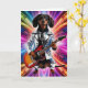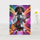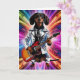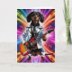 Um Dachshund em uma roupa prateada brilhante está tocando guitarra com um fundo psicodélico.