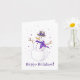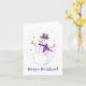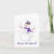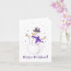 Um lindo cartão de inverno roxo e prateado! Ilustração de uma dama de neve alegre vestida com um cachecol roxo sofisticado e um chapéu com laço, aproveitando a magia do inverno. Flocos de neve minúsculos em forma de coração roxo pairam ao seu redor; a mensagem "Feliz Natal" está inscrita abaixo dela.