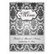 Damasco preto em um cartão prateado do Menu de Casamento. Você pode ajustar o texto de acordo com as suas necessidades.
